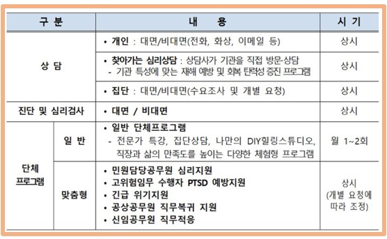 인사혁신처는 전국 9개 도시에 걸쳐 공무원 마음건강센터를 운영하며, 민원담당자와 신임공무원을 위한 특화 프로그램을 진행 중입니다. 특히, 최근 3년간 민원담당자들을 위한 맞춤형 프로그램 참가자가 급증하였으며, 이들의 직무 스트레스 해소와 심리적 안정을 위해 다양한 치유 활동이 제공되고 있습니다.