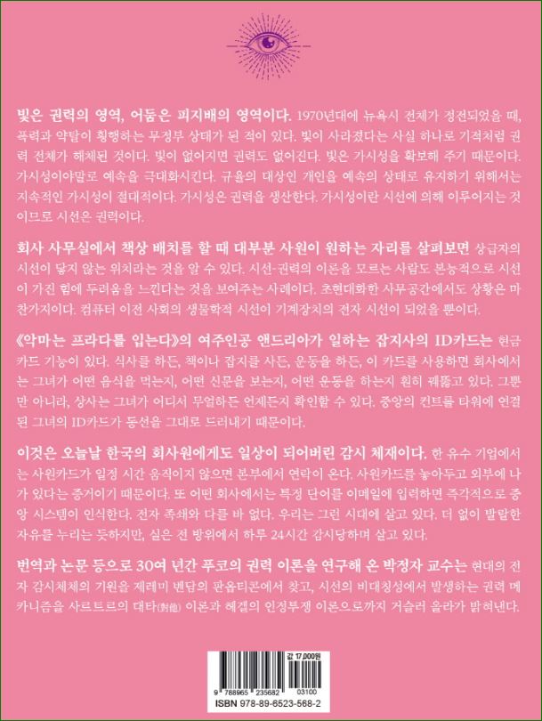 시선은 단순한 눈길이 아니라, 상대를 통제하고 규정하는 무형의 권력이자 사회적 관계의 근간이다. 이 흥미로운 책은 프랑스 철학자 미셸 푸코의 <감시와 처벌>을 중심으로 현대사회 권력의 실체를 탐구한다.