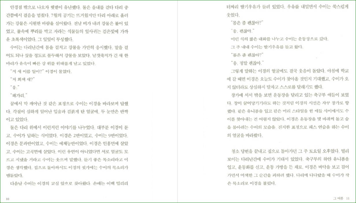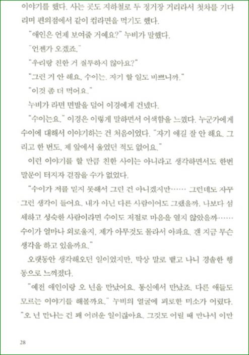 우리는 서로 다른 사람이고, 서로 다른 상황 속에서 살아가기에 서로를 완벽히 이해하기란 어렵습니다. 그러나 최은영 작가의 이야기는 우리에게 말합니다. 진정한 이해란 상대를 향한 깊은 관심에서 출발한다는 것, 그리고 그 관심이 결국 ‘상처 없는 관계’를 만들어 간다는 것을요.