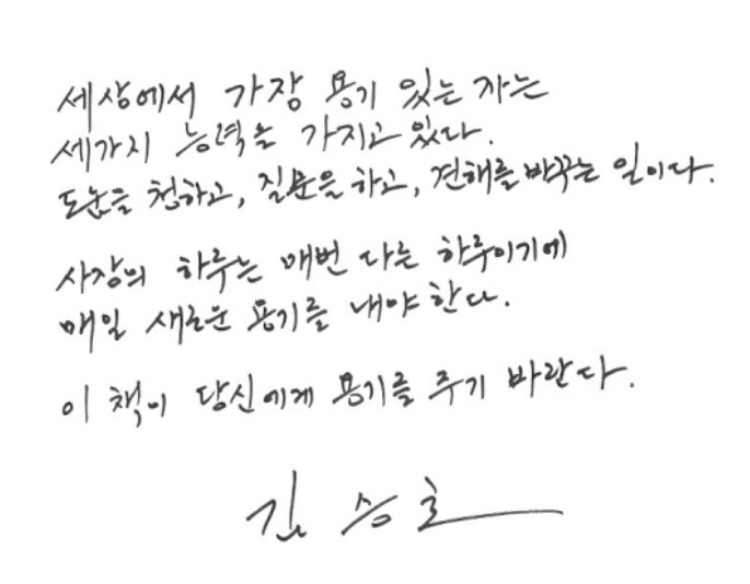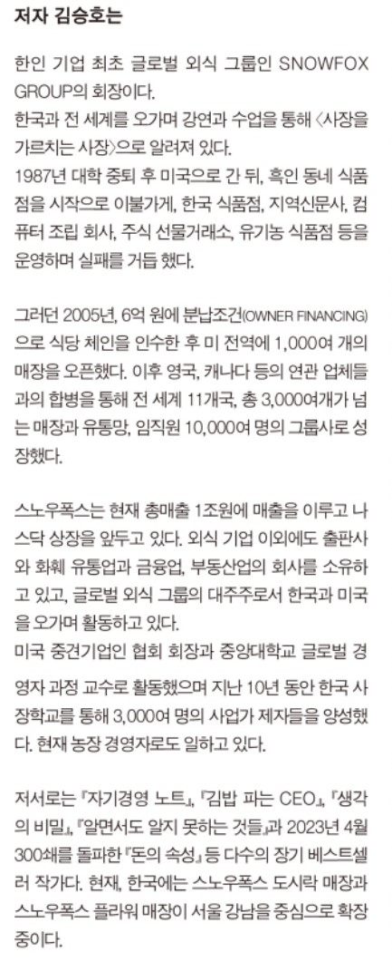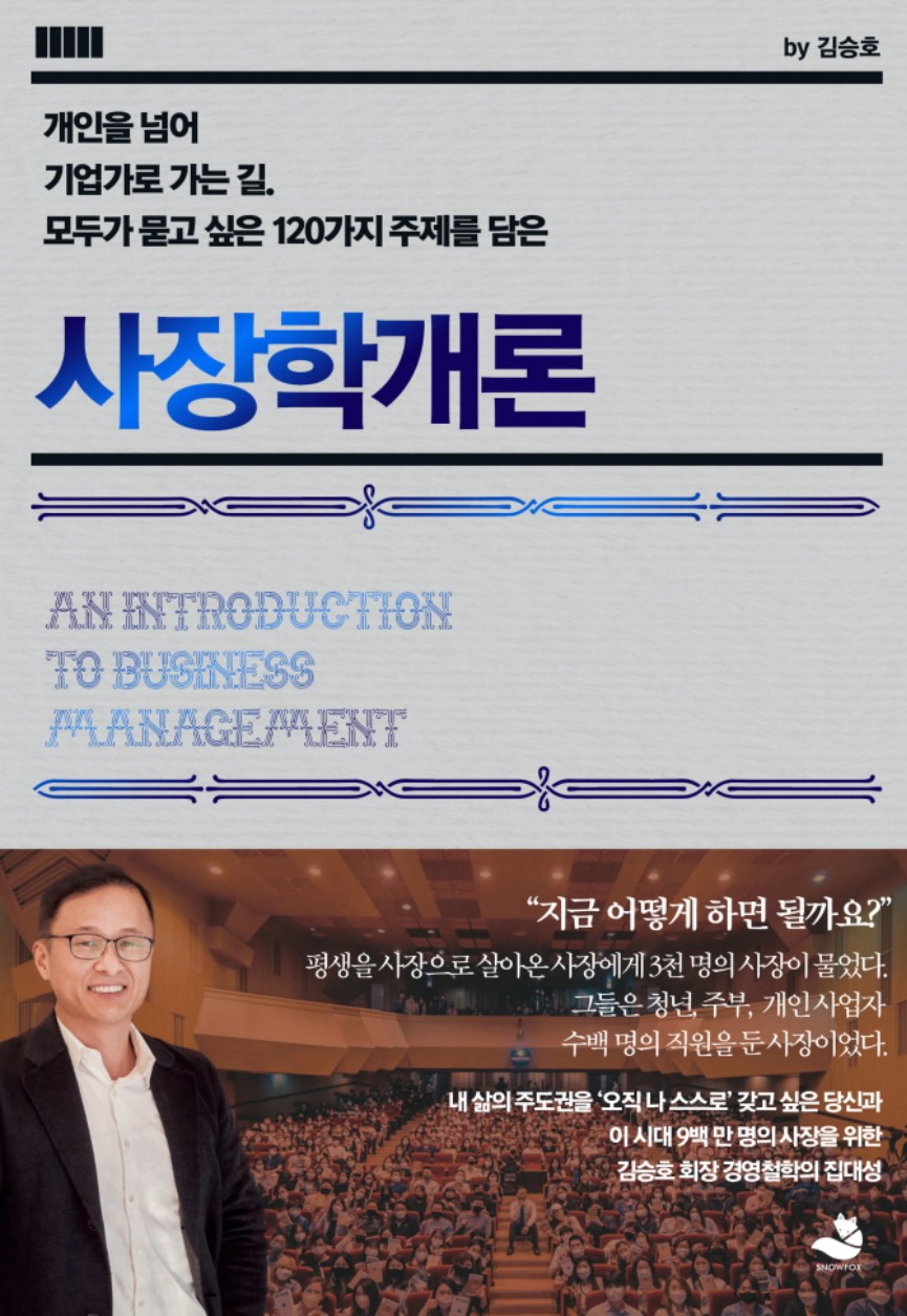 김승호 회장님의 사장학개론은 단순히 경영의 기술을 알려주는 책이 아닙니다. 사장님으로서 자신만의 길을 찾는 모든 분께 꼭 읽어 보시라고 권하고 싶어요.
