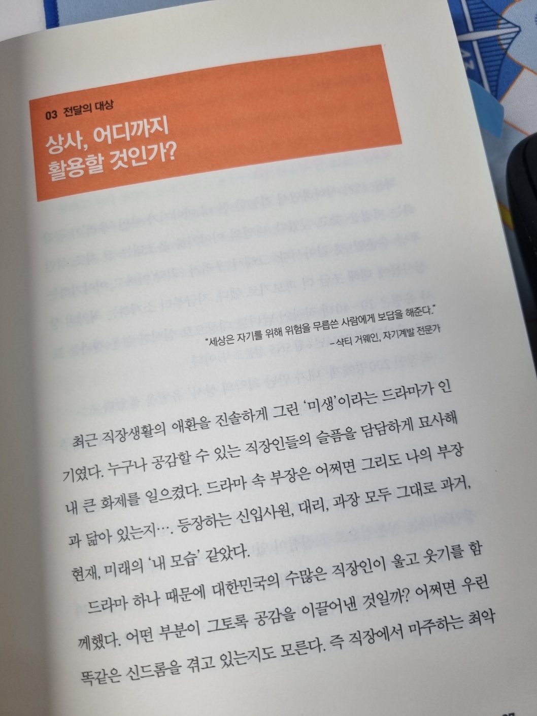 여러분도 공감하실 텐데요, 직장에서 가장 중요한 것은 바로 '관계'입니다. 상사, 동료, 후배와의 관계가 직장 생활의 성패를 좌우한다고 해도 과언이 아니죠. 송과장은 각 관계별로 효과적인 소통 방법과 갈등 해결 전략을 세세하게 풀어줍니다. 특히, 상사와의 관계에서 적절한 피드백을 주고받는 방법이나, 후배들과의 소통에서 필요한 리더십 스킬을 강조합니다. 변호사나 대출 상담사처럼 사람을 자주 만나는 직업군에게도 유용할 내용이네요. 여러분도 이 책을 통해 관계의 중요성을 다시 한번 느껴보세요! 🤝