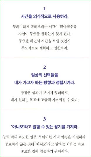 책에서는 하루를 아침, 오후, 저녁으로 나누고, 각각의 시간대에 할 일을 3가지만 정하는 단순한 방법을 제안합니다.