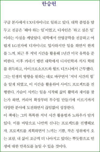 저자는 구글 본사에서 UX 디자이너로 일하며, 퇴근 후 시간을 개인 프로젝트에 투자해 자신만의 성장을 이루어낸 이야기를 전합니다. 조직 생활에서, ‘저녁 시간을 어떻게 보내느냐’에 따라 개인의 커리어와 삶이 전혀 다른 궤도로 나아갈 수 있음을 생각해 보세요.