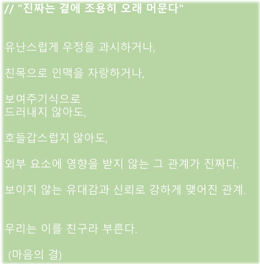 유난스럽게 우정을 과시하거나, 친목으로 인맥을 자랑하거나, 보여주기식으로 드러내지 않아도, 호들갑스럽지 않아도, 외부 요소에 영향을 받지 않는 그 관계가 진짜다. 보이지 않는 유대감과 신뢰로 강하게 맺어진 관계. 우리는 이를 친구라 부른다.